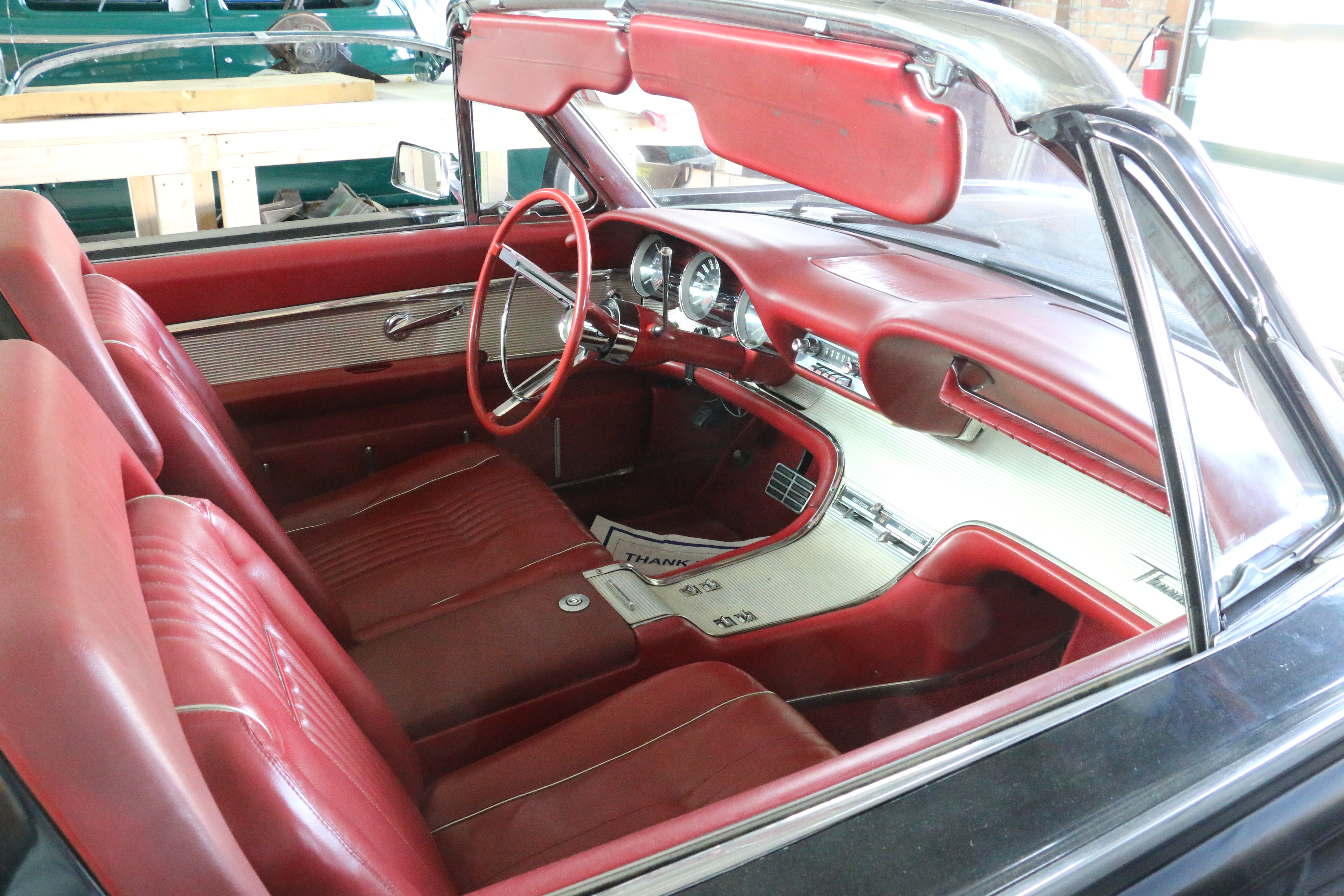 The Thunderbird for 1961 introduced several firsts for the automotive market. The most distinctive feature of the 1961 to 1963 Thunderbirds was the highly touted ‘Swing Away’ steering wheel. With the transmission in the park position the steering wheel would slide approximately 18 inches (460 mm) to the right allowing the driver to exit the vehicle easily. Other innovations include a floating rear view mirror. Common on all autos produced today, this feature was first found on 1961 Thunderbirds. Depending on variable options Thunderbirds for 1961 could be purchased with options like air conditioning, power windows, power seats, AM radio, fender skirts and white wall tires. Several standard features, like power steering and power brakes, back up lights and bucket seats were costly options on most other autos.
